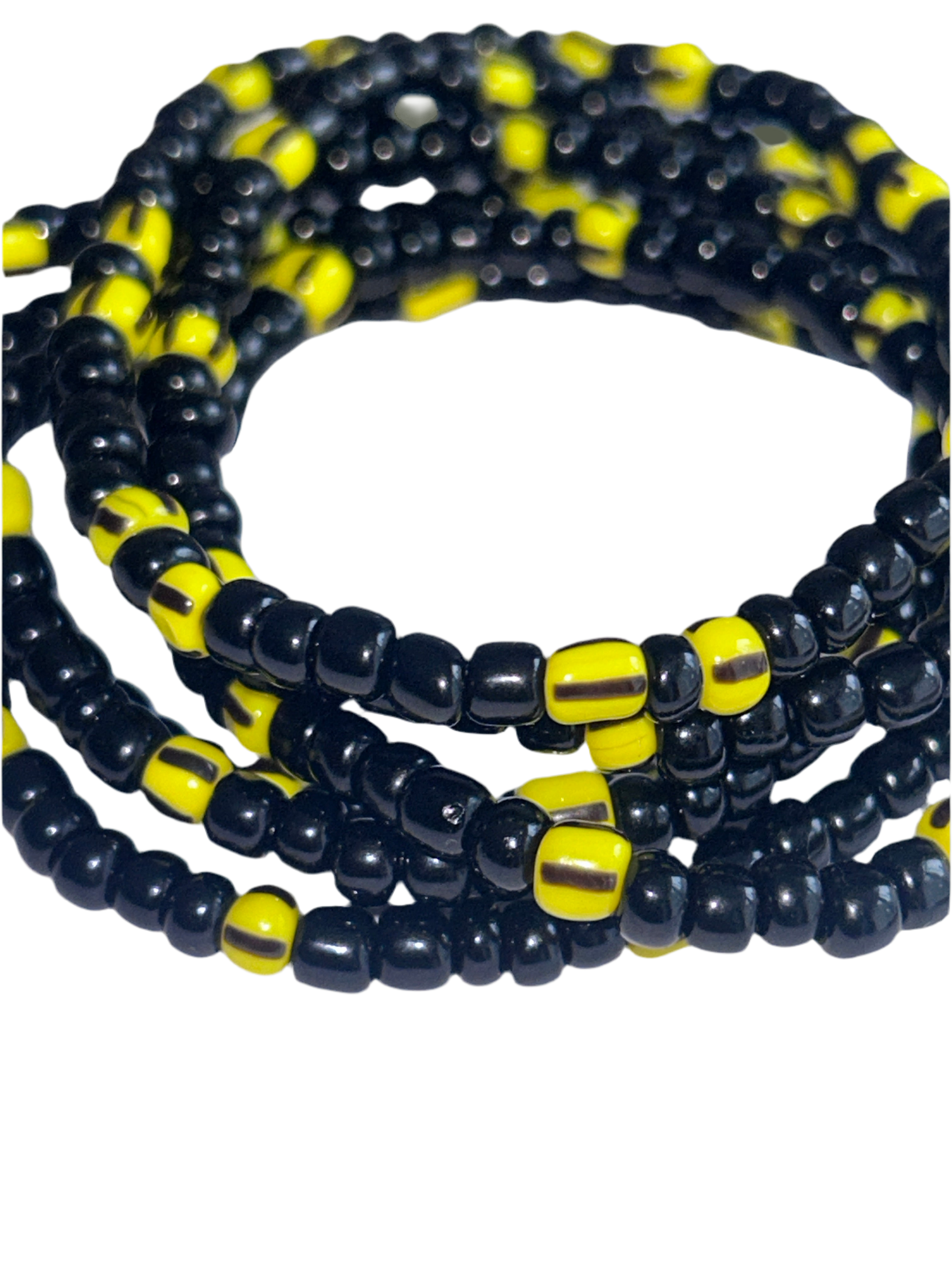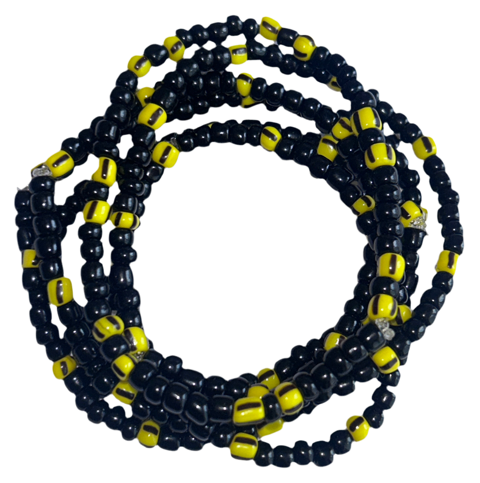 Black opaque glass beads with yellow & black striped bead on elastic thread
