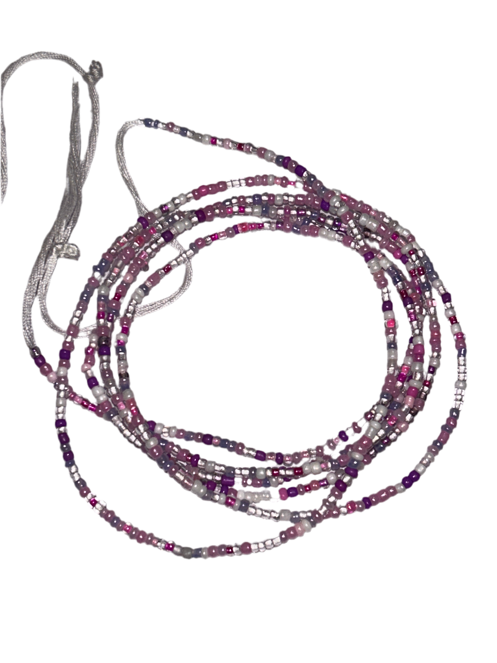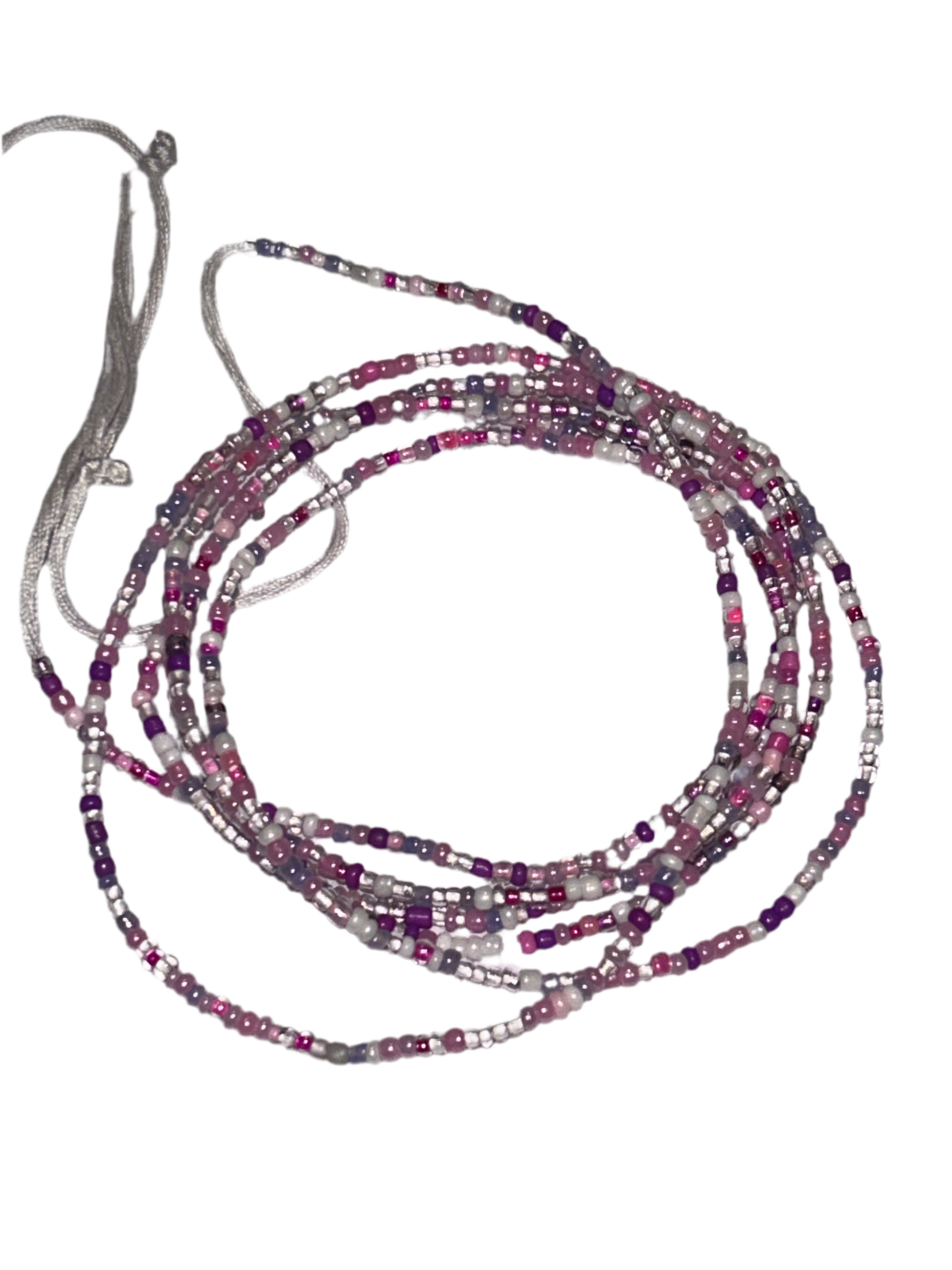 A mix of 2mm pink, purple, white and clear glass beads on cotton thread