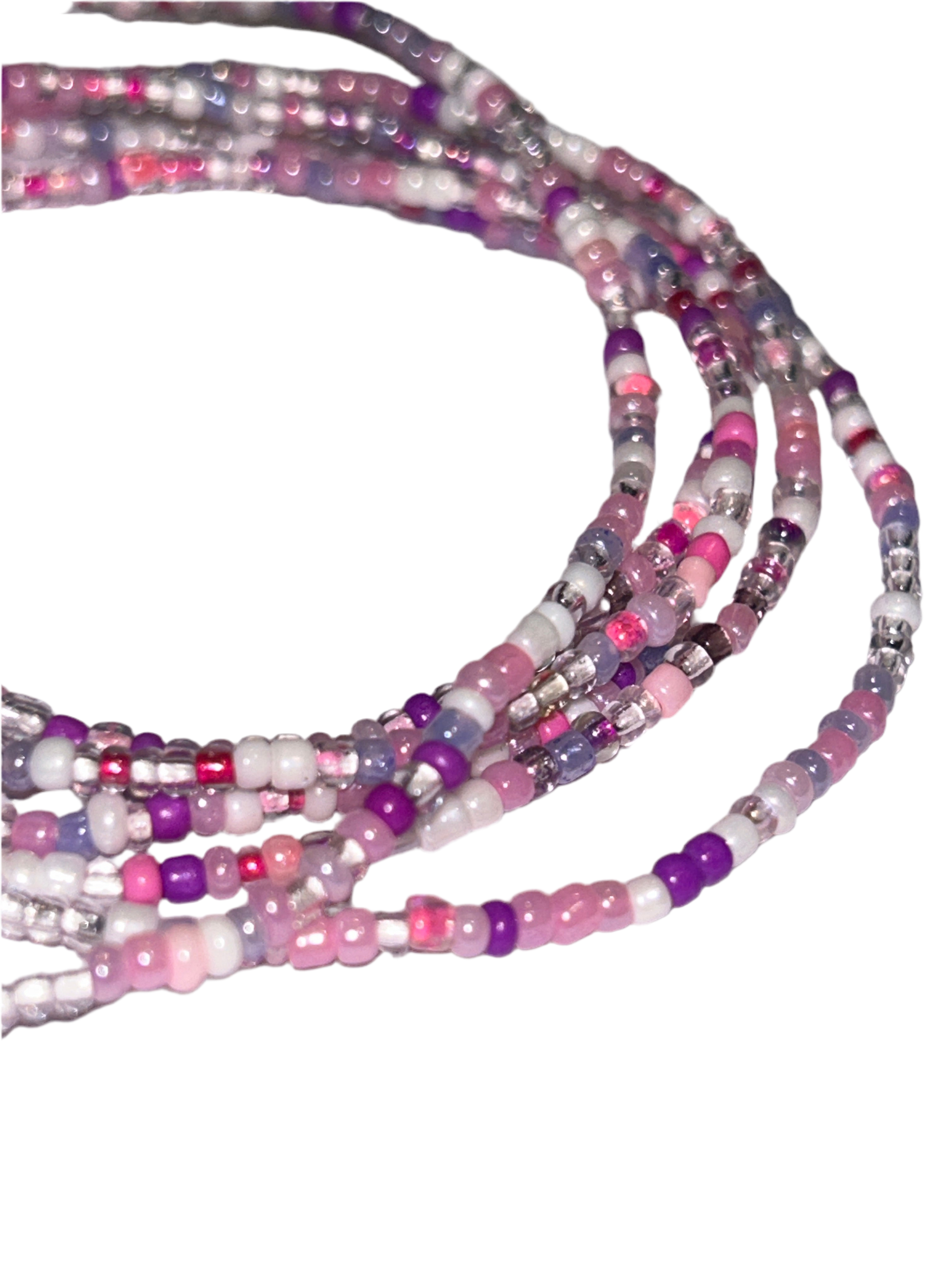The pink & purple beads may fade over time and will alter the overall colour of the waistbeads.