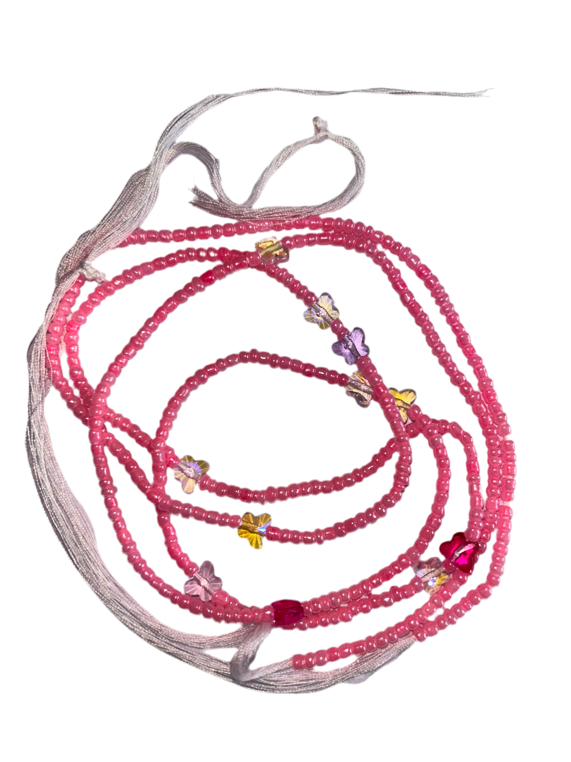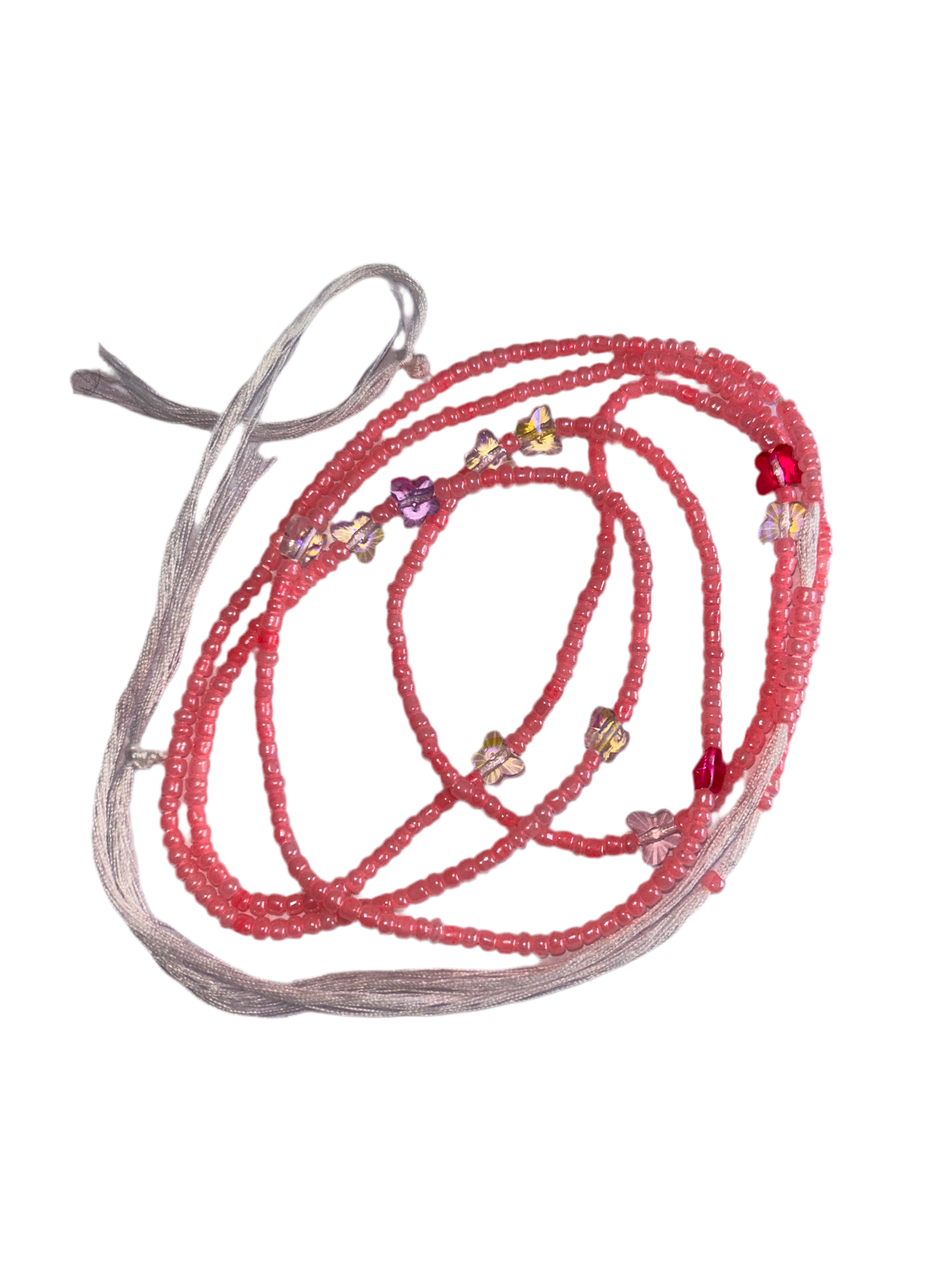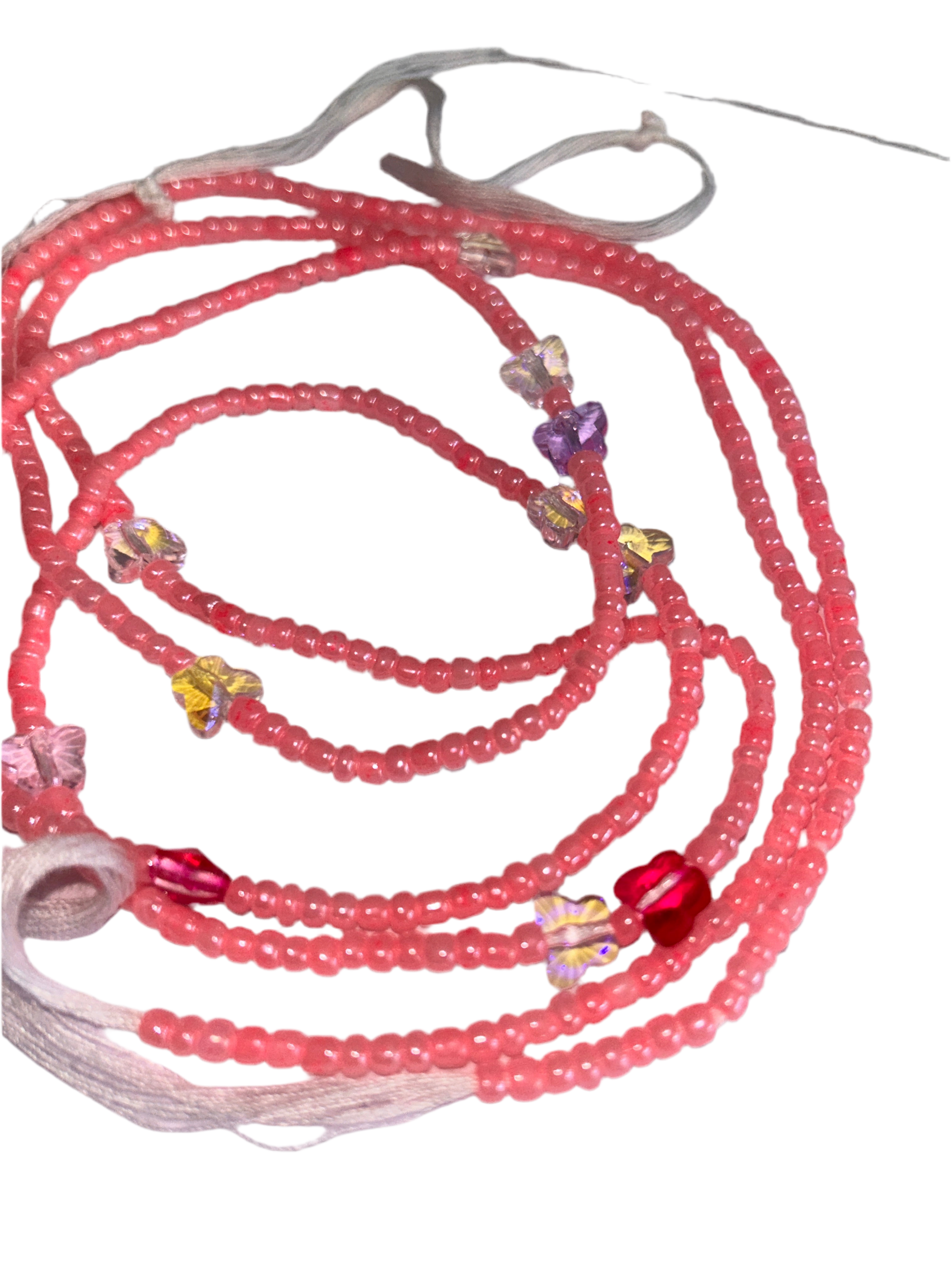 Please note that the beads may not be exactly as shown in the picture, as they are custom-made. The pink beads may fade over time and will alter the overall colour of the waistbeads.